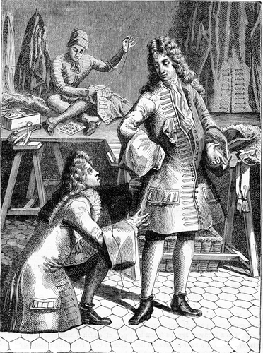 Fig. A. Tailleur de costard à l’ouvrage. Gravure XVIIᵉ.